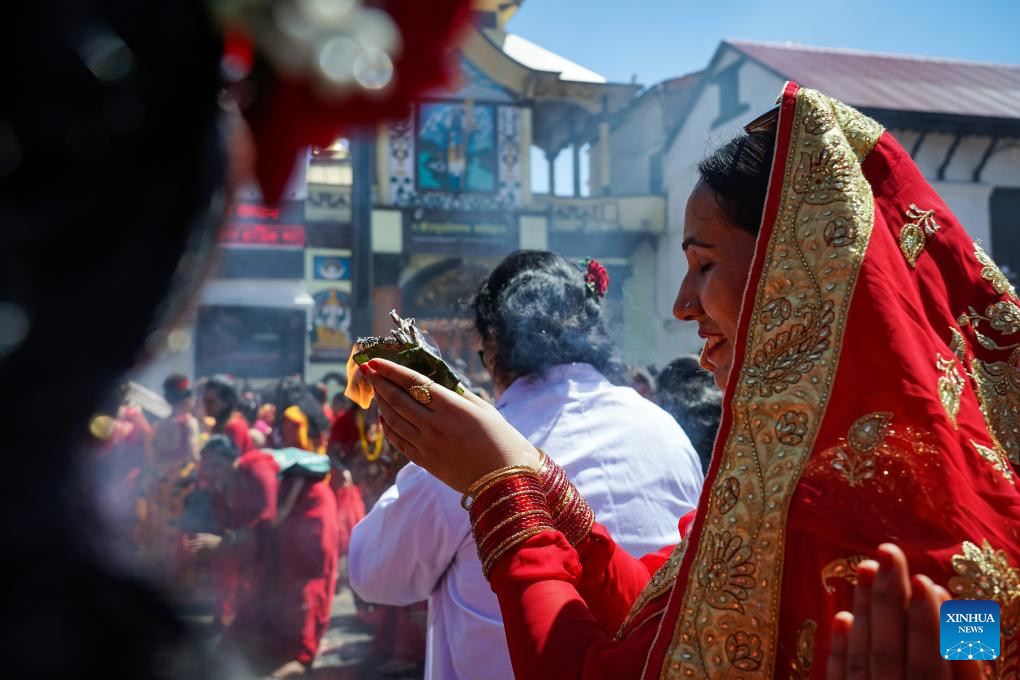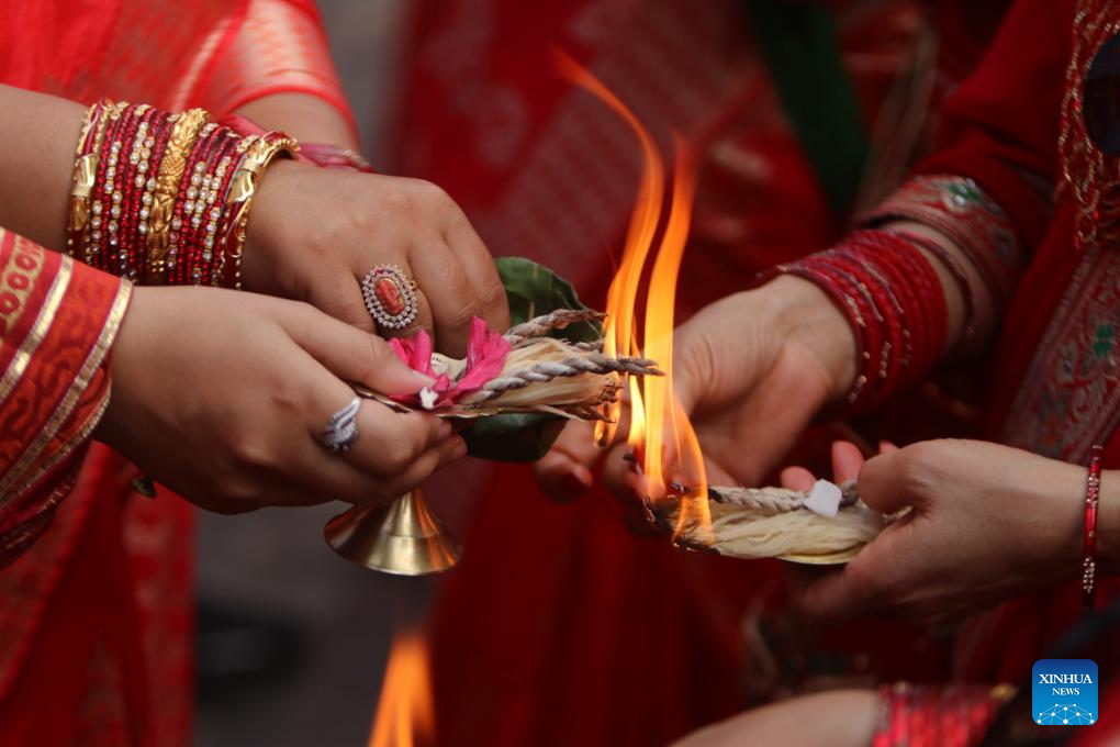 Women offer prayers during the Teej Festival in Kathmandu, Nepal, Sept. 18, 2023. (Photo by Sulav Shrestha/Xinhua)