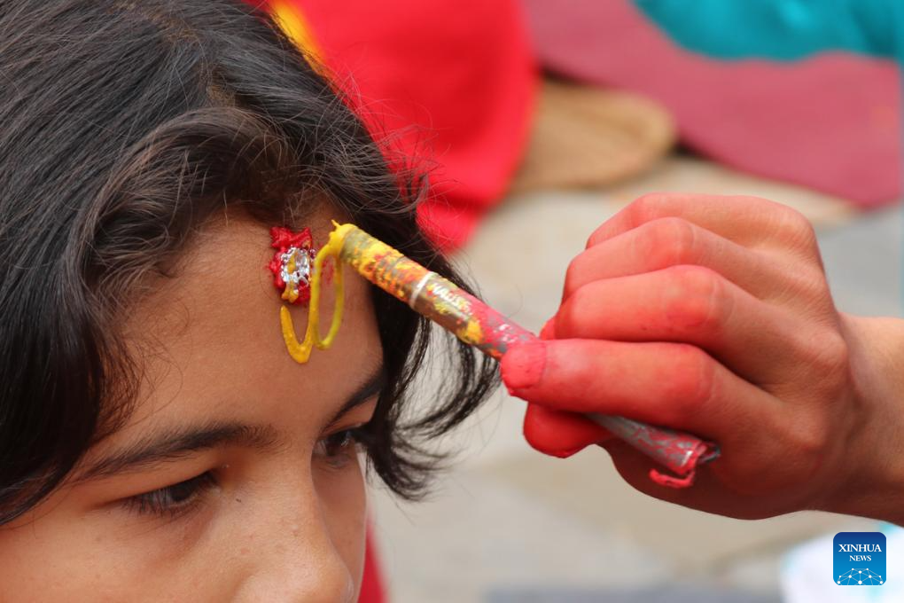 A woman receives tika on the forehead as blessings during the Teej Festival in Kathmandu, Nepal, Sept. 18, 2023. (Photo by Sulav Shrestha/Xinhua)
