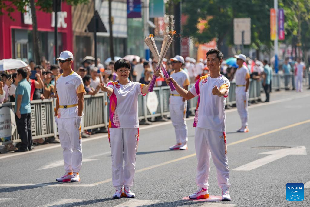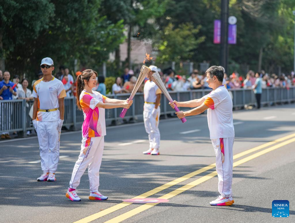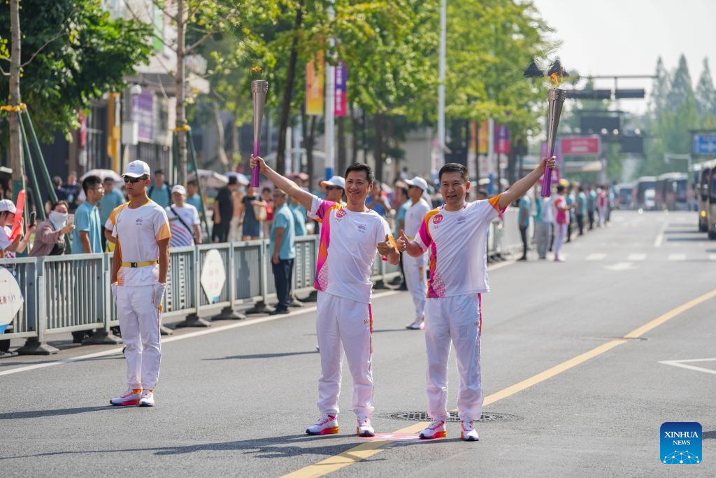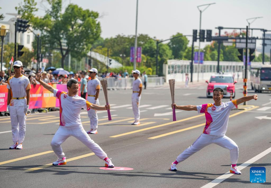 Torch bearers Liu Xian (L) and Hu Guoping pass the flame during the torch relay of the 19th Asian Games in Quzhou, east China's Zhejiang Province, Sept. 19, 2023. (Xinhua/Sun Fei)