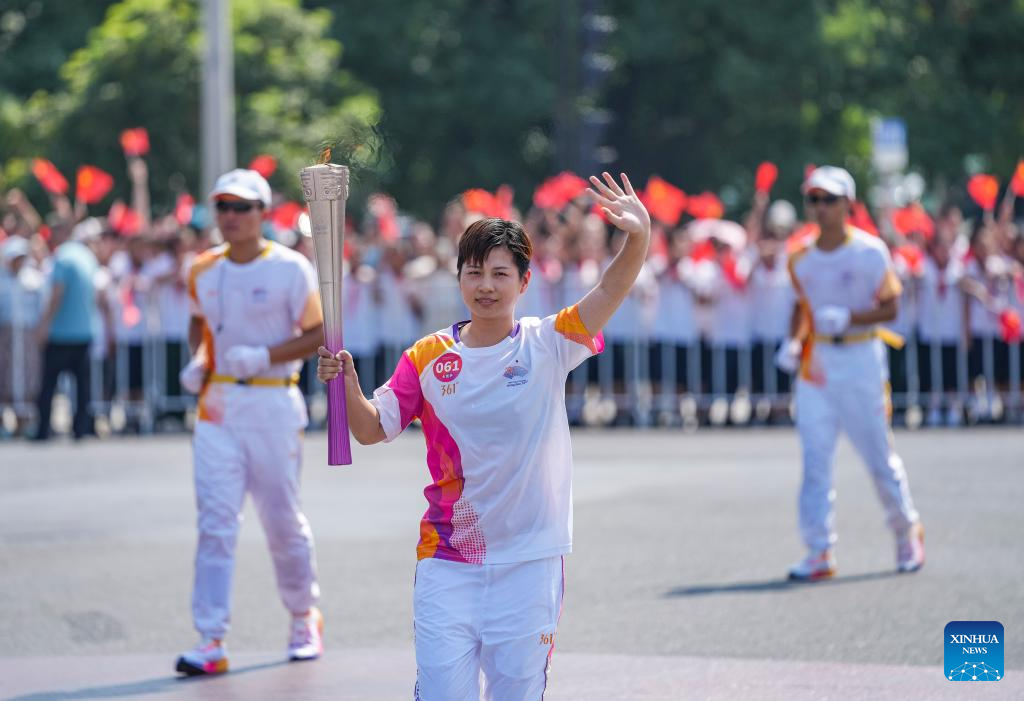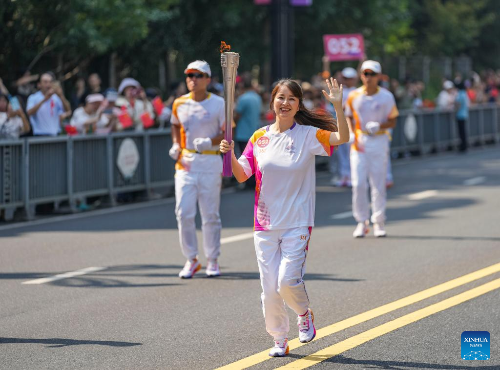 Torch bearer Kong Lingli runs with the torch during the torch relay of the 19th Asian Games in Quzhou, east China's Zhejiang Province, Sept. 19, 2023. (Xinhua/Sun Fei)