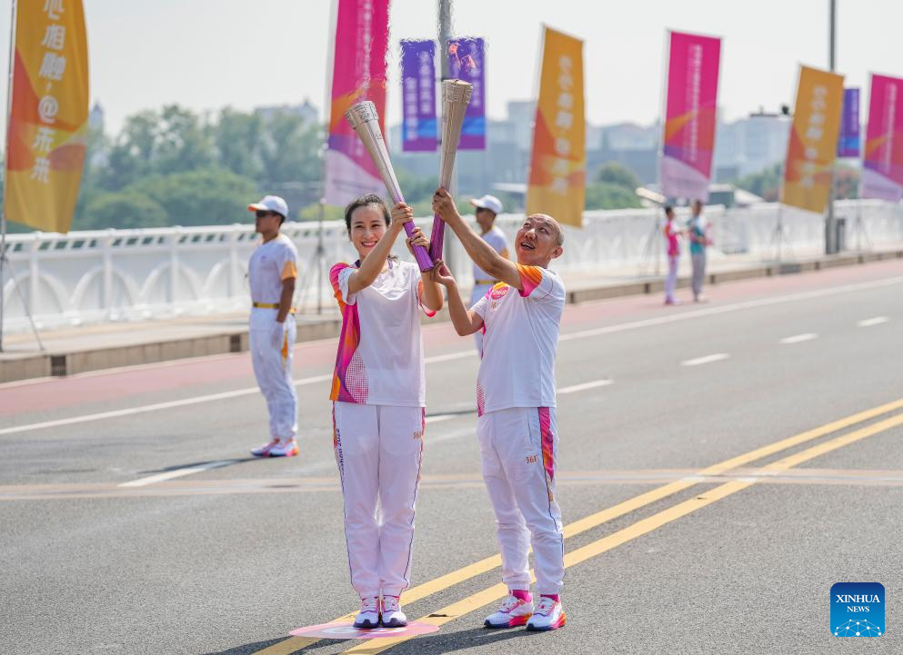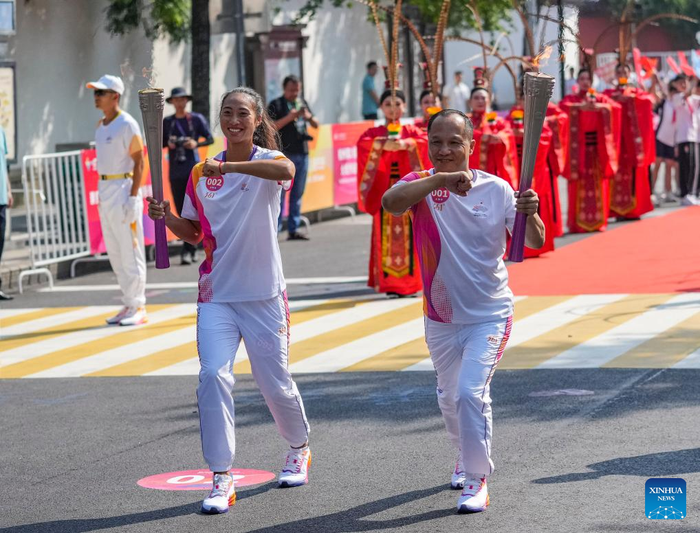 Torch bearers Lu Xiaowen (L) and Kuai Jun pose during the torch relay of the 19th Asian Games in Quzhou, east China's Zhejiang Province, Sept. 19, 2023. (Xinhua/Sun Fei)