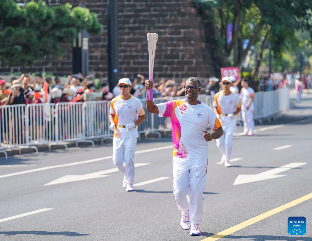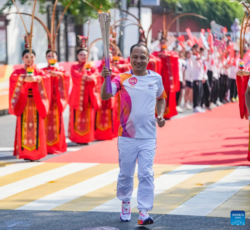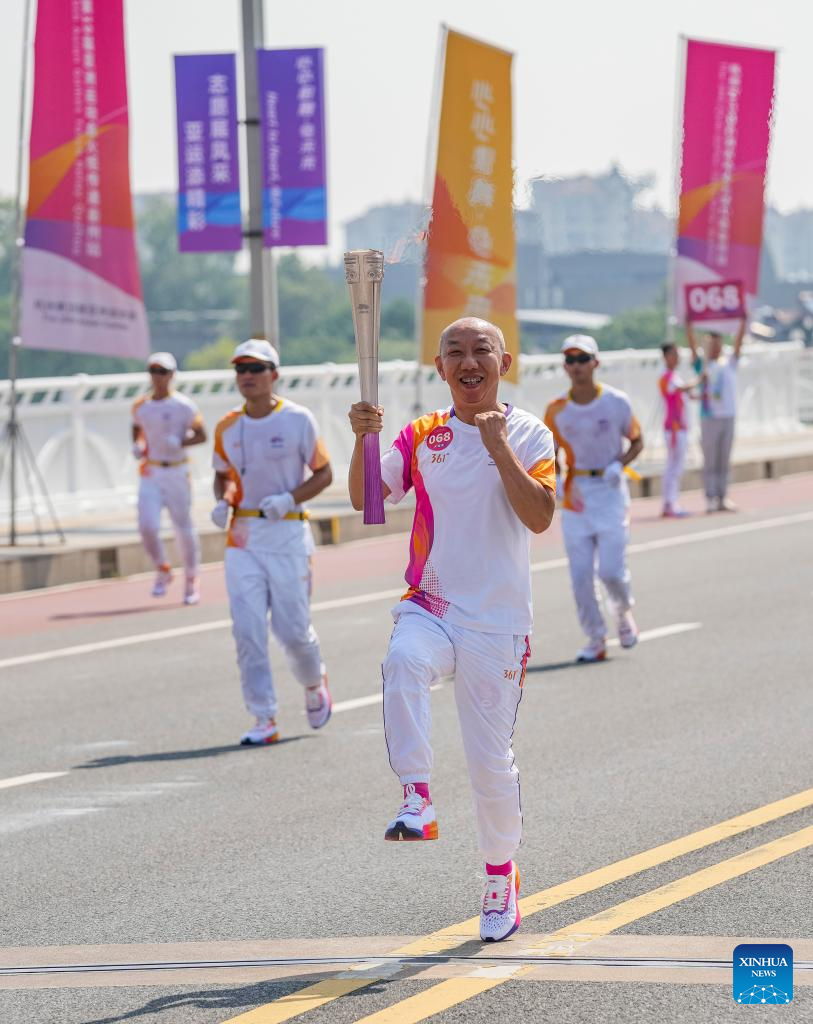Torch bearer Cai Weiwei runs with the torch the torch relay of the 19th Asian Games in Quzhou, east China's Zhejiang Province, Sept. 19, 2023. (Xinhua/Sun Fei)