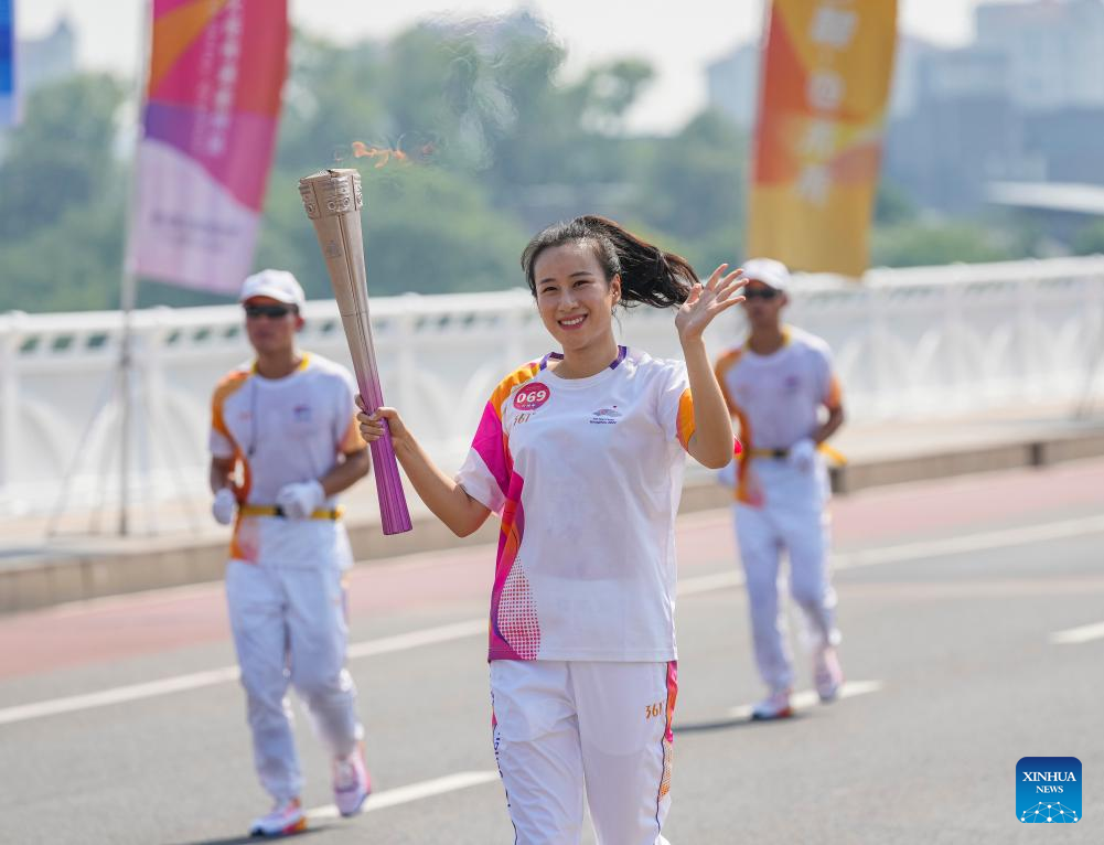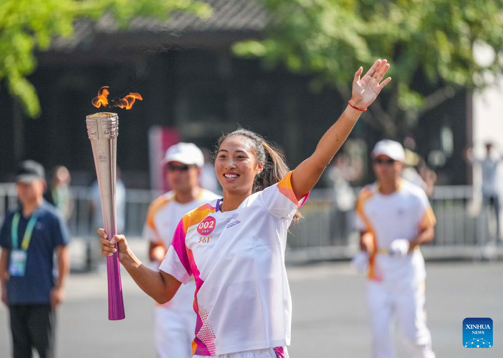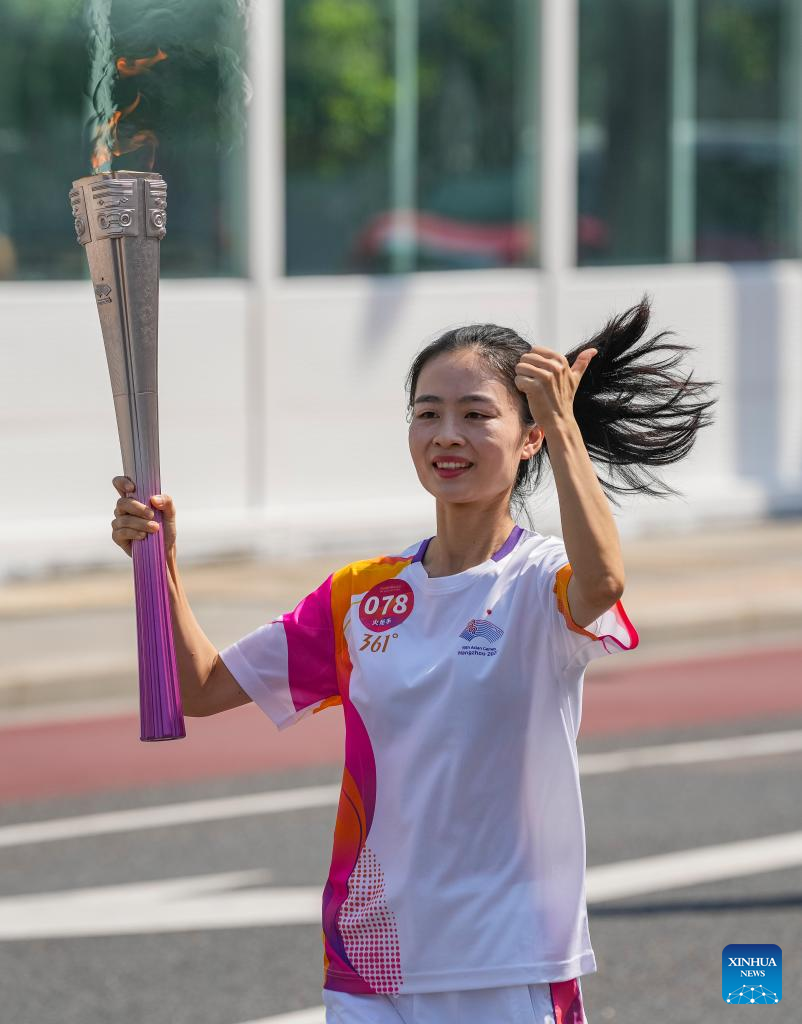 Torch bearer Cheng Ying runs with the torch during the torch relay of the 19th Asian Games in Quzhou, east China's Zhejiang Province, Sept. 19, 2023. (Xinhua/Sun Fei)