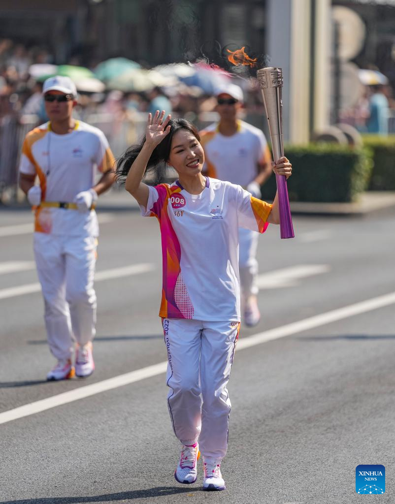 Torch bearer Rakhil Fernando runs with the torch during the torch relay of the 19th Asian Games in Quzhou, east China's Zhejiang Province, Sept. 19, 2023. (Xinhua/Sun Fei)