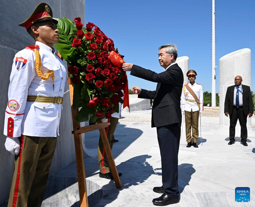 Li Xi, a member of the Standing Committee of the Political Bureau of the Communist Party of China (CPC) Central Committee and secretary of the CPC Central Commission for Discipline Inspection, lays a wreath to the monument of Jose Marti in Havana, Cuba, Sept. 16, 2023. At the invitation of the Communist Party of Cuba, Li paid an official friendly visit to Cuba from Saturday to Monday. (Xinhua/Zhang Ling)