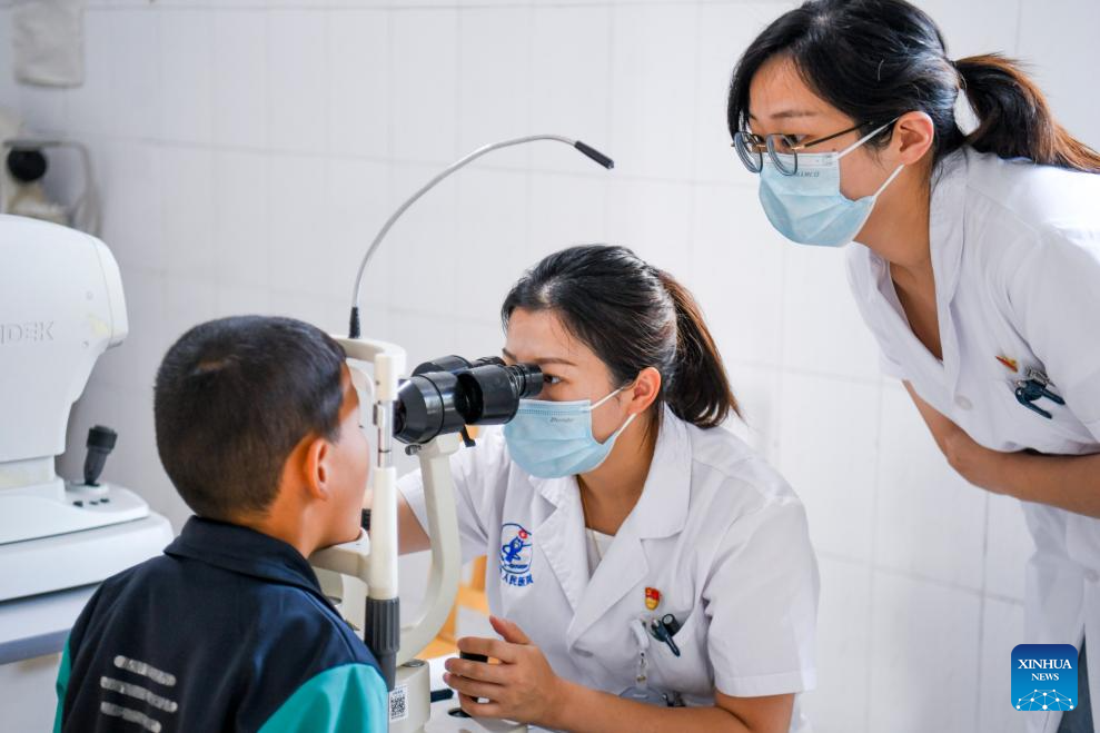Medical workers from east China's Shandong Province conduct free optical examination for a patient in Kashgar, northwest China's Xinjiang Uygur Autonomous Region, Sept. 15, 2023. Medical workers from east China's Shandong Province have provided medical service for the local people in Kashgar. (Xinhua/Wang Fei)