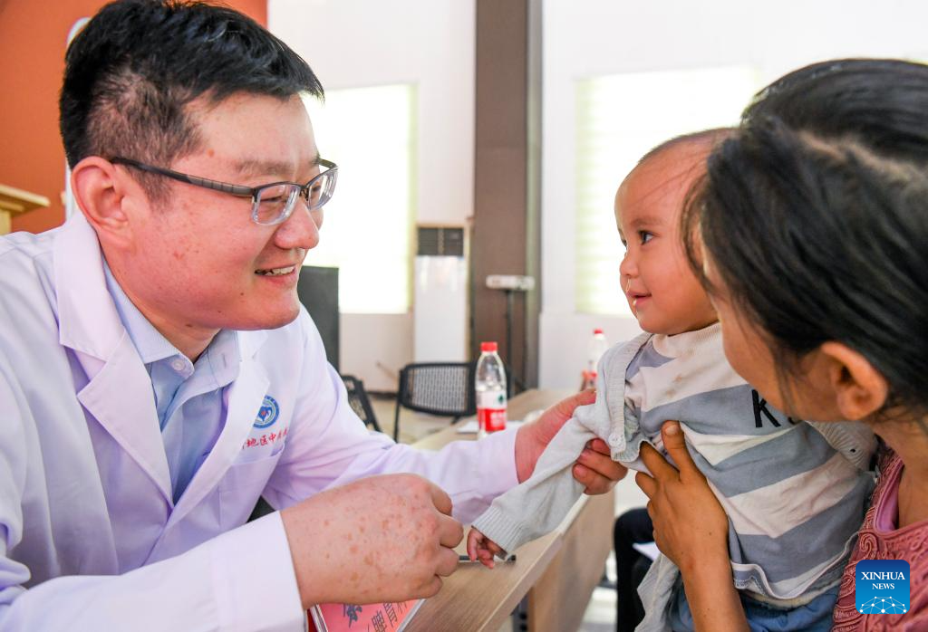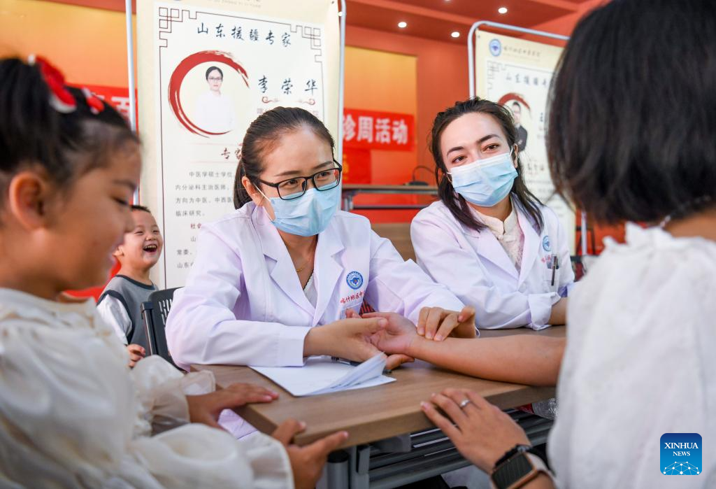 A medical worker from east China's Shandong Province gives free consultation in Kashgar, northwest China's Xinjiang Uygur Autonomous Region, Sept. 16, 2023. Medical workers from east China's Shandong Province have provided medical service for the local people in Kashgar. (Xinhua/Wang Fei)