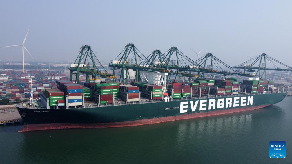 This aerial photo taken on Sept. 18, 2023 shows a cargo ship docked at Tianjin Port in north China's Tianjin.?(Xinhua/Zhao Zishuo)