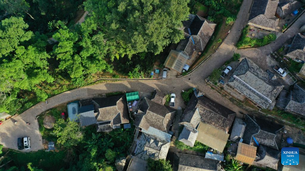 This aerial photo taken on Sept. 14, 2023 shows the Nuogang Village in Pu'er City, southwest China's Yunnan Province. The Cultural Landscape of Old Tea Forests of Jingmai Mountain in Pu'er was inscribed on the UNESCO World Heritage List on Sunday at the extended 45th session of the UNESCO World Heritage Committee in Riyadh, Saudi Arabia, making it China's 57th World Heritage Site. (Xinhua/Hu Chao)