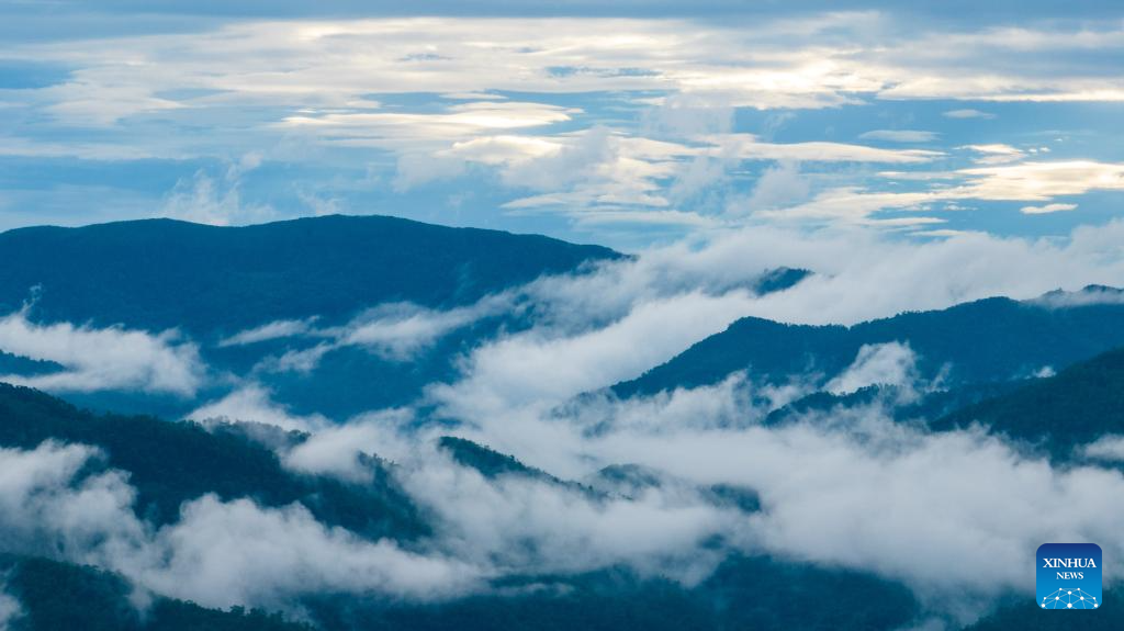 This aerial photo taken on Sept. 17, 2023 shows the Jingmai Mountain in Pu'er City, southwest China's Yunnan Province. The Cultural Landscape of Old Tea Forests of Jingmai Mountain in Pu'er was inscribed on the UNESCO World Heritage List on Sunday at the extended 45th session of the UNESCO World Heritage Committee in Riyadh, Saudi Arabia, making it China's 57th World Heritage Site. (Xinhua/Tang Rufeng)