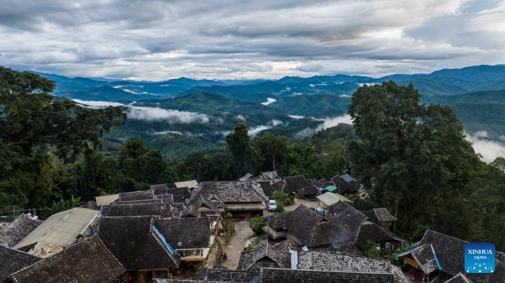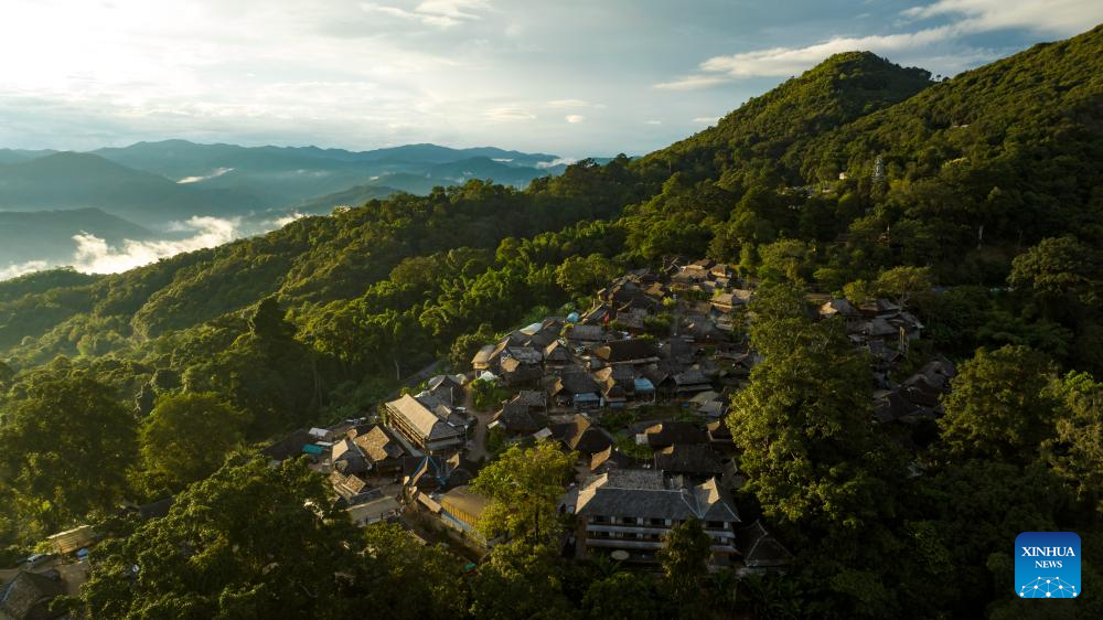 This aerial photo taken on Sept. 18, 2023 shows the Wengji Village in Pu'er City, southwest China's Yunnan Province. The Cultural Landscape of Old Tea Forests of Jingmai Mountain in Pu'er was inscribed on the UNESCO World Heritage List on Sunday at the extended 45th session of the UNESCO World Heritage Committee in Riyadh, Saudi Arabia, making it China's 57th World Heritage Site. (Xinhua/Hu Chao)