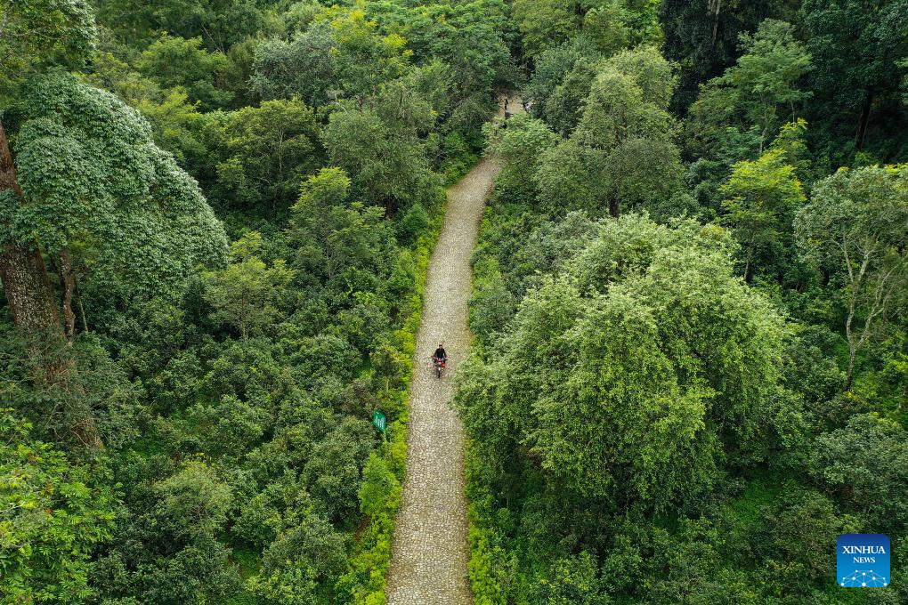 This aerial photo taken on Aug. 29, 2023 shows an old tea forest in Pu'er City, southwest China's Yunnan Province. The Cultural Landscape of Old Tea Forests of Jingmai Mountain in Pu'er was inscribed on the UNESCO World Heritage List on Sunday at the extended 45th session of the UNESCO World Heritage Committee in Riyadh, Saudi Arabia, making it China's 57th World Heritage Site. (Xinhua/Li He)