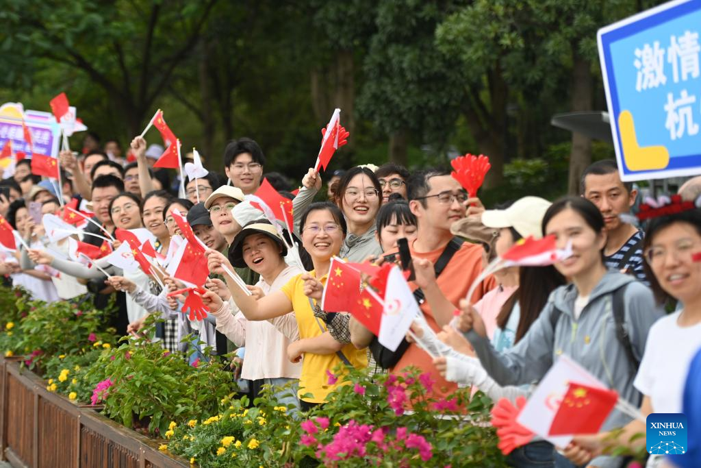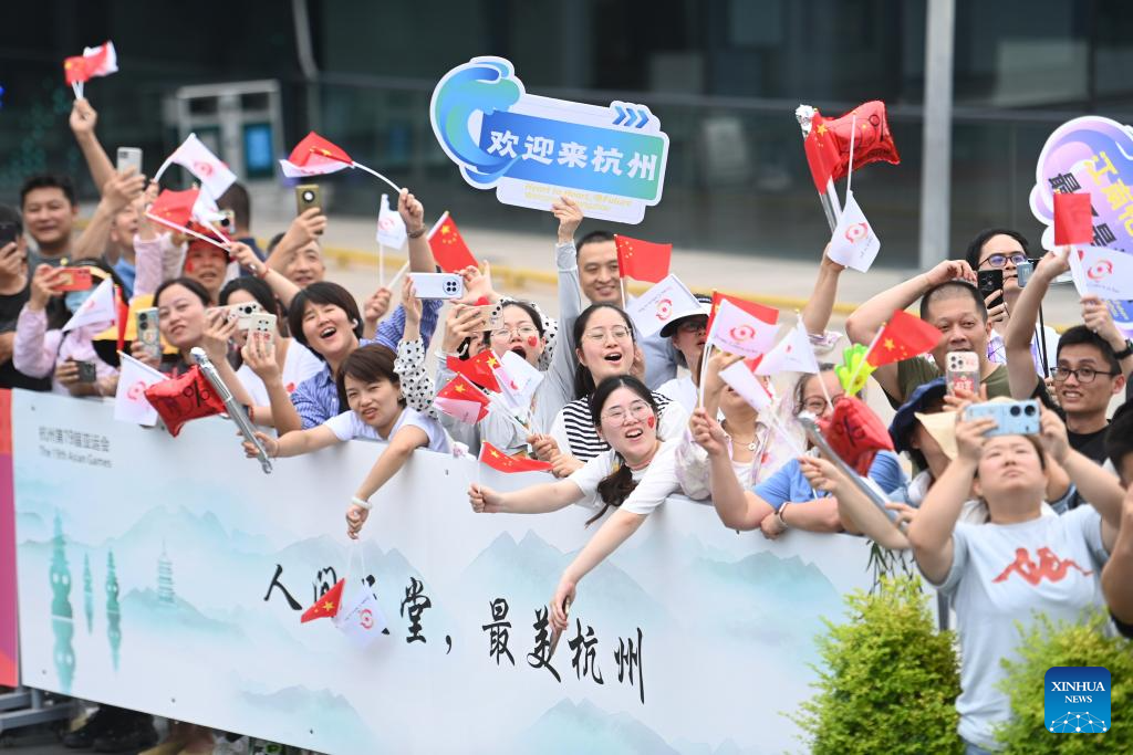 People cheer for torch bearers during the torch relay of the 19th Asian Games in Hangzhou, capital of east China's Zhejiang Province, Sept. 20, 2023. (Xinhua/Huang Zongzhi)