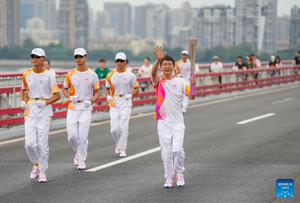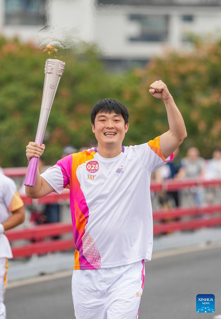 Torch bearer Long Yang runs with the torch during the torch relay of the 19th Asian Games in Hangzhou, capital of east China's Zhejiang Province, Sept. 20, 2023. (Xinhua/Huang Zongzhi)