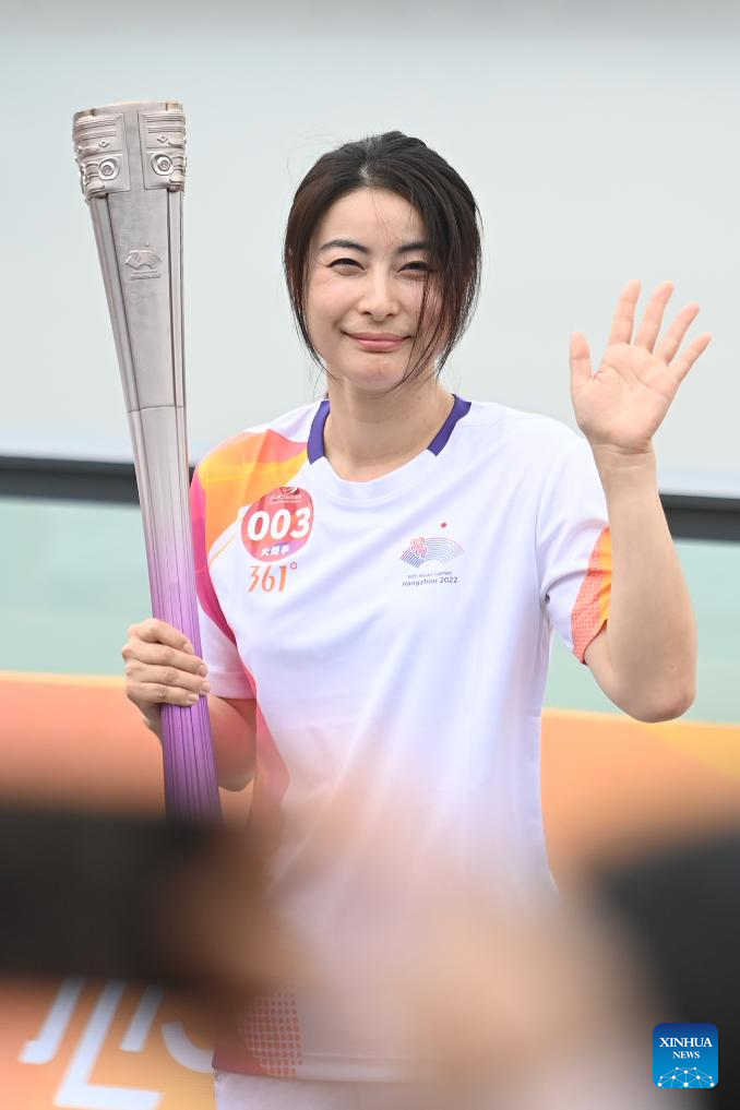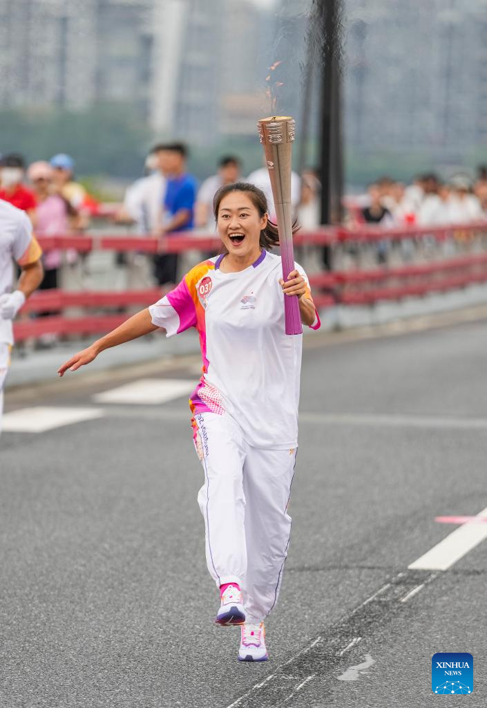 Torch bearer Guo Jingjing is seen during the torch relay of the 19th Asian Games in Hangzhou, capital of east China's Zhejiang Province, Sept. 20, 2023. (Xinhua/Huang Zongzhi)