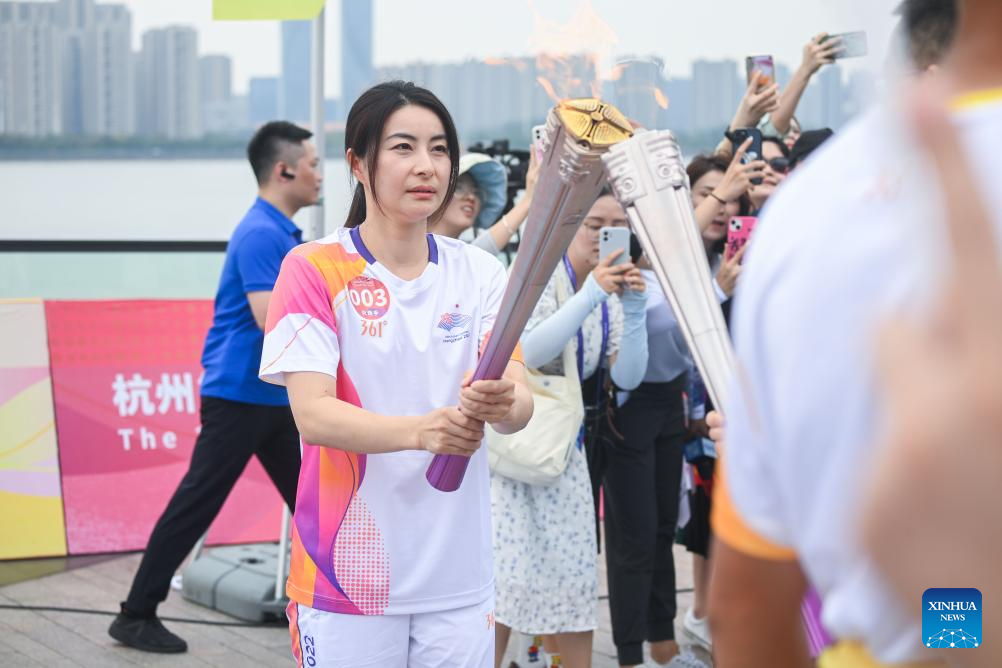 Torch bearer Guo Jingjing passes the flame during the torch relay of the 19th Asian Games in Hangzhou, capital of east China's Zhejiang Province, Sept. 20, 2023. (Xinhua/Xu Yu)