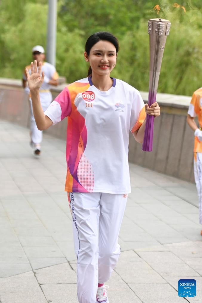 Torch bearer Ni Jiaqi runs with the torch during the torch relay of the 19th Asian Games in Hangzhou, capital of east China's Zhejiang Province, Sept. 20, 2023. (Xinhua/Sun Fei)