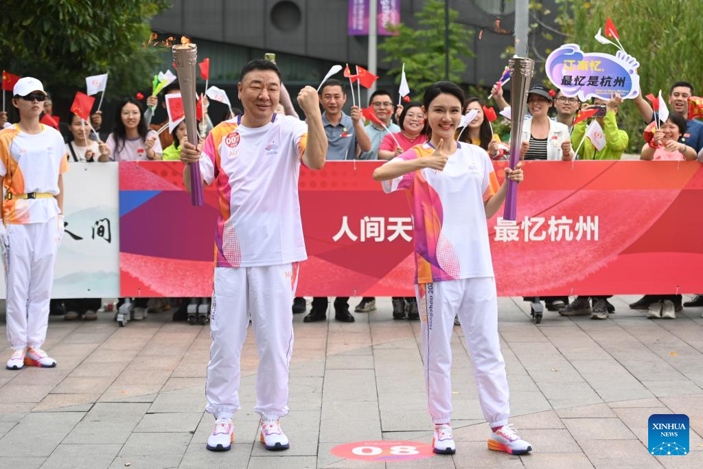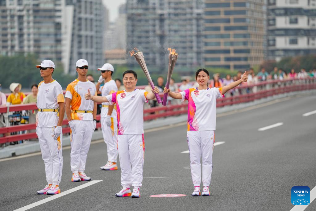 Torch bearers Long Yang (R) and Wang Jianyi pose during the torch relay of the 19th Asian Games in Hangzhou, capital of east China's Zhejiang Province, Sept. 20, 2023. (Xinhua/Huang Zongzhi)