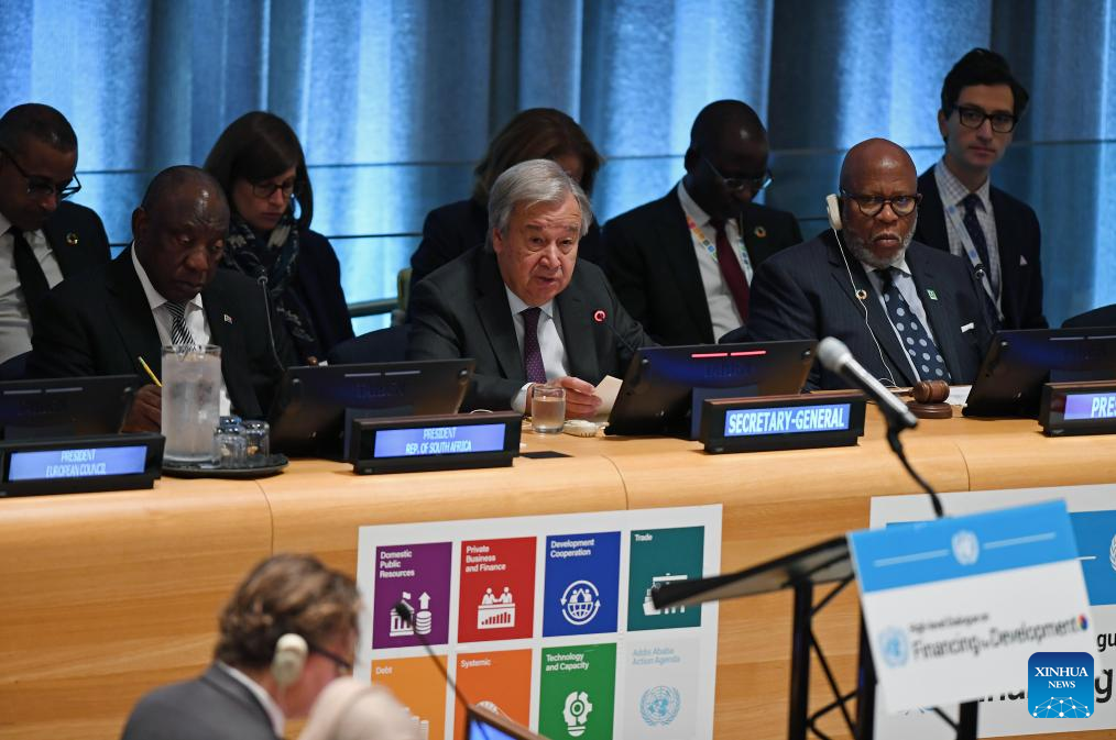 UN Secretary-General Antonio Guterres (C) speaks at the UN High-level Dialogue on Financing for Development during the 78th session of the UN General Assembly at the UN headquarters in New York, on Sept. 20, 2023. The UN chief on Wednesday urged global policymakers to unlock better financing and tackle the great finance divide, as progress on some of the Sustainable Development Goals has gone into reverse for the first time in decades. (Xinhua/Li Rui)