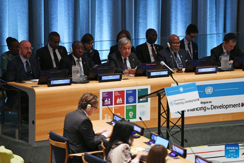The UN High-level Dialogue on Financing for Development is held during the 78th session of the UN General Assembly at the UN headquarters in New York, on Sept. 20, 2023. The UN chief on Wednesday urged global policymakers to unlock better financing and tackle the great finance divide, as progress on some of the Sustainable Development Goals has gone into reverse for the first time in decades. (Xinhua/Li Rui)