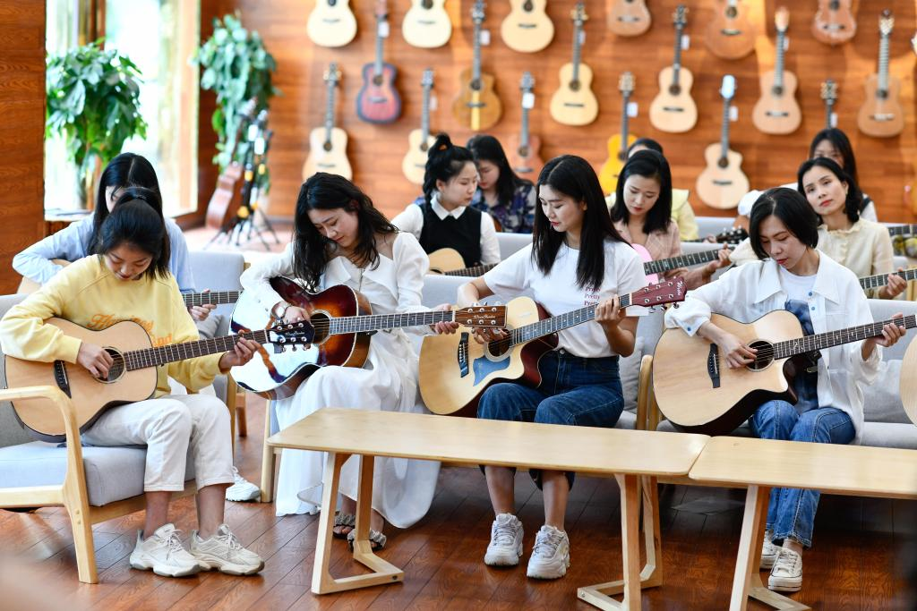 People learn to play guitar at a showroom of Natasha Musical Instrument Manufacturing Co., Ltd. in Zheng'an County, southwest China's Guizhou Province, May 13, 2022. (Xinhua/Yang Wenbin)