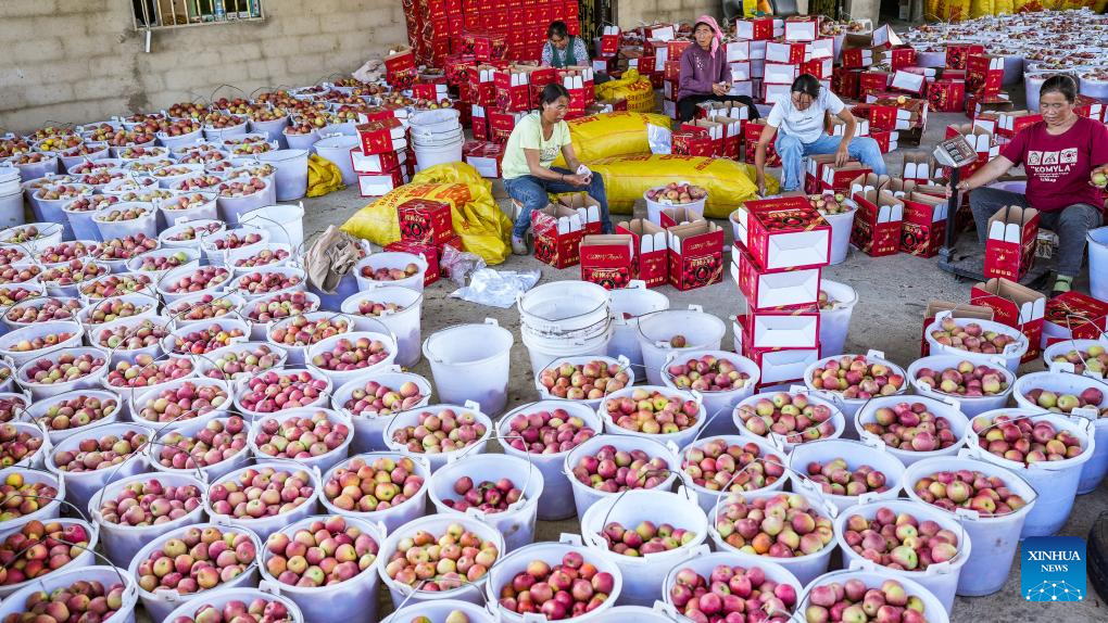 Villagers pack apples in Xiejia Village in Weining Yi-Hui-Miao Autonomous County, southwest China's Guizhou Province, Sept. 20, 2023. Local farmers are busy picking and packing apples in the harvest season to meet the market demand. (Xinhua/Tao Liang)