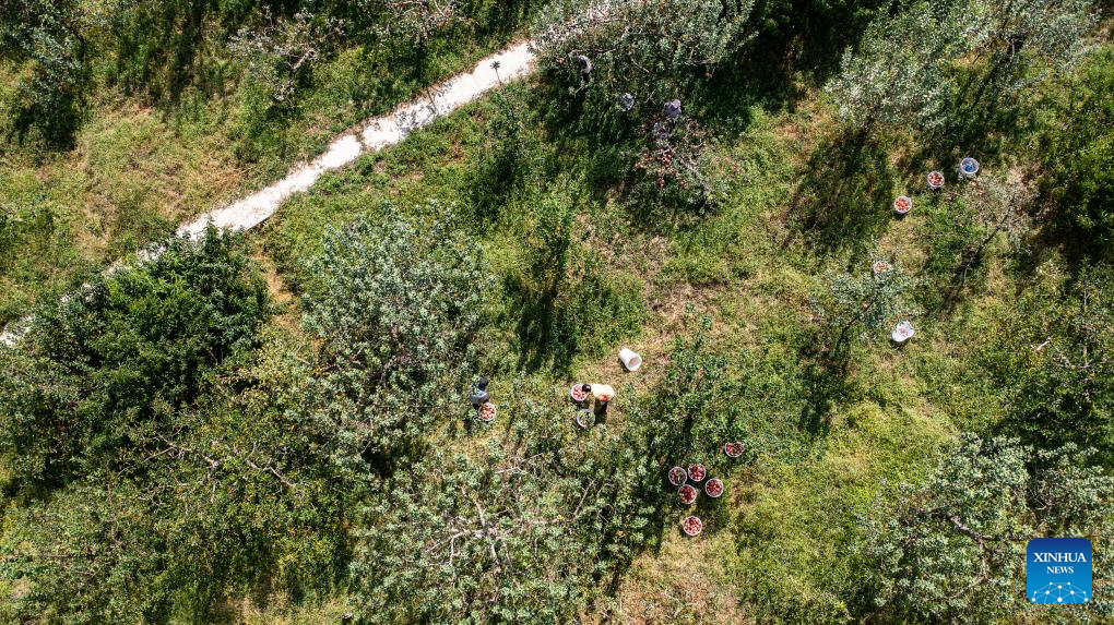 A villager harvests apples in Xiejia Village in Weining Yi-Hui-Miao Autonomous County, southwest China's Guizhou Province, Sept. 20, 2023. Local farmers are busy picking and packing apples in the harvest season to meet the market demand. (Xinhua/Tao Liang)