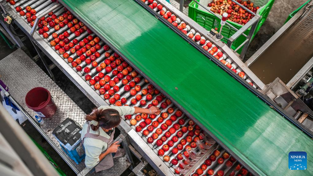 A worker sorts apples at a fruit factory in Xiejia Village in Weining Yi-Hui-Miao Autonomous County, southwest China's Guizhou Province, Sept. 20, 2023. Local farmers are busy picking and packing apples in the harvest season to meet the market demand. (Xinhua/Tao Liang)