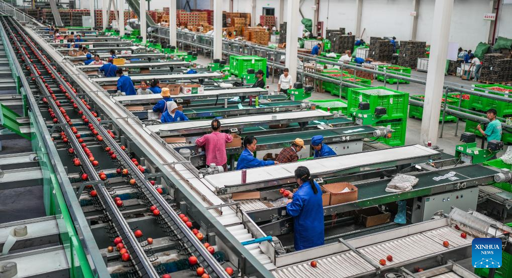 Workers sort apples at a fruit factory in Xiejia Village in Weining Yi-Hui-Miao Autonomous County, southwest China's Guizhou Province, Sept. 20, 2023. Local farmers are busy picking and packing apples in the harvest season to meet the market demand. (Xinhua/Tao Liang)