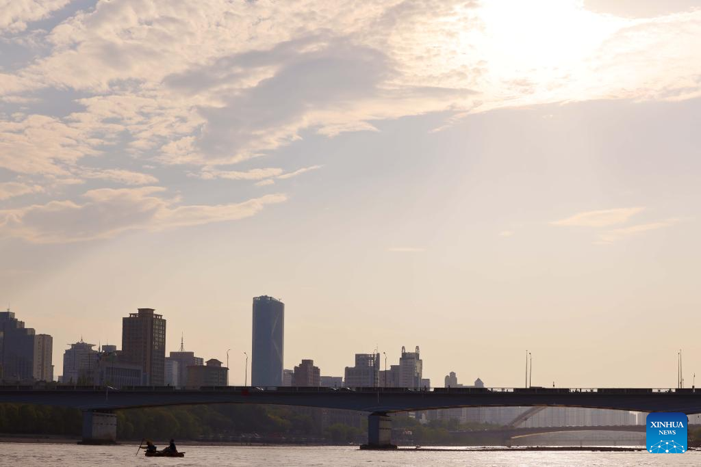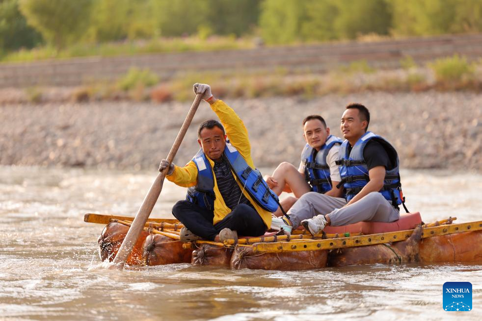 Tourists take a sheepskin raft on the Yellow River in Lanzhou, northwest China's Gansu Province, Sept. 5, 2023. Niu Qiang, a sheepskin raft worker from Huining of northwest China's Gansu Province, has been doing the job for 27 years since 16 years old on the Lanzhou section of the Yellow River. (Xinhua/Xing Guangli)