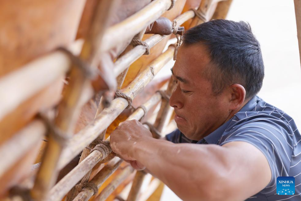 Niu Qiang fixes a sheepskin raft in Lanzhou, northwest China's Gansu Province, Sept. 5, 2023. (Xinhua/Xing Guangli)