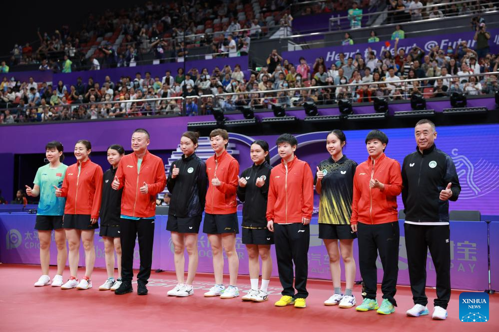 Seak Hui Li (top) of China's Macao hits a return to Chen Meng of China during the women's team preliminary group A match between China and China's Macao at the 19th Asian Games in Hangzhou, east China's Zhejiang Province, Sept. 22, 2023. (Xinhua/Sun Fei)