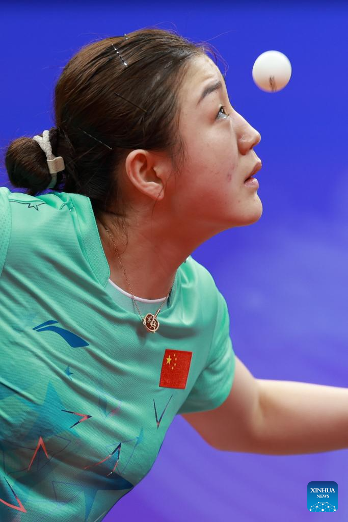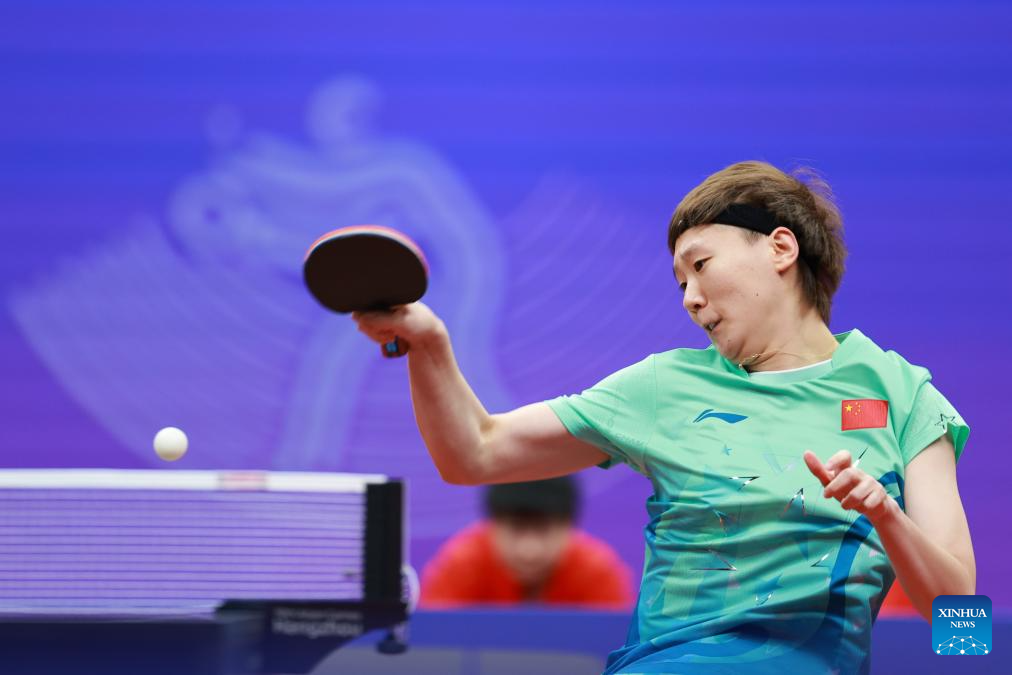 Chen Meng of China competes against Seak Hui Li of China's Macao during the women's team preliminary group A match between China and China's Macao at the 19th Asian Games in Hangzhou, east China's Zhejiang Province, Sept. 22, 2023. (Xinhua/Liu Xu)