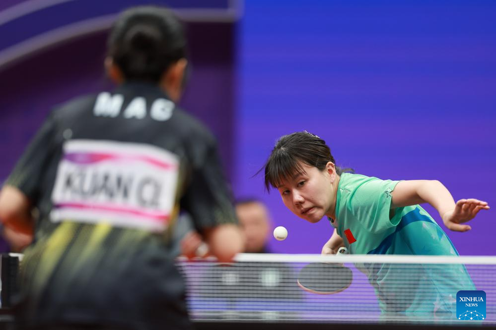 Wang Manyu of China competes against Cheong Chi Hun of China's Macao during the women's team preliminary group A match between China and China's Macao at the 19th Asian Games in Hangzhou, east China's Zhejiang Province, Sept. 22, 2023. (Xinhua/Liu Xu)