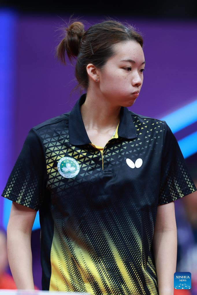 Seak Hui Li of China's Macao competes against Chen Meng of China during the women's team preliminary group A match between China and China's Macao at the 19th Asian Games in Hangzhou, east China's Zhejiang Province, Sept. 22, 2023. (Xinhua/Liu Xu)