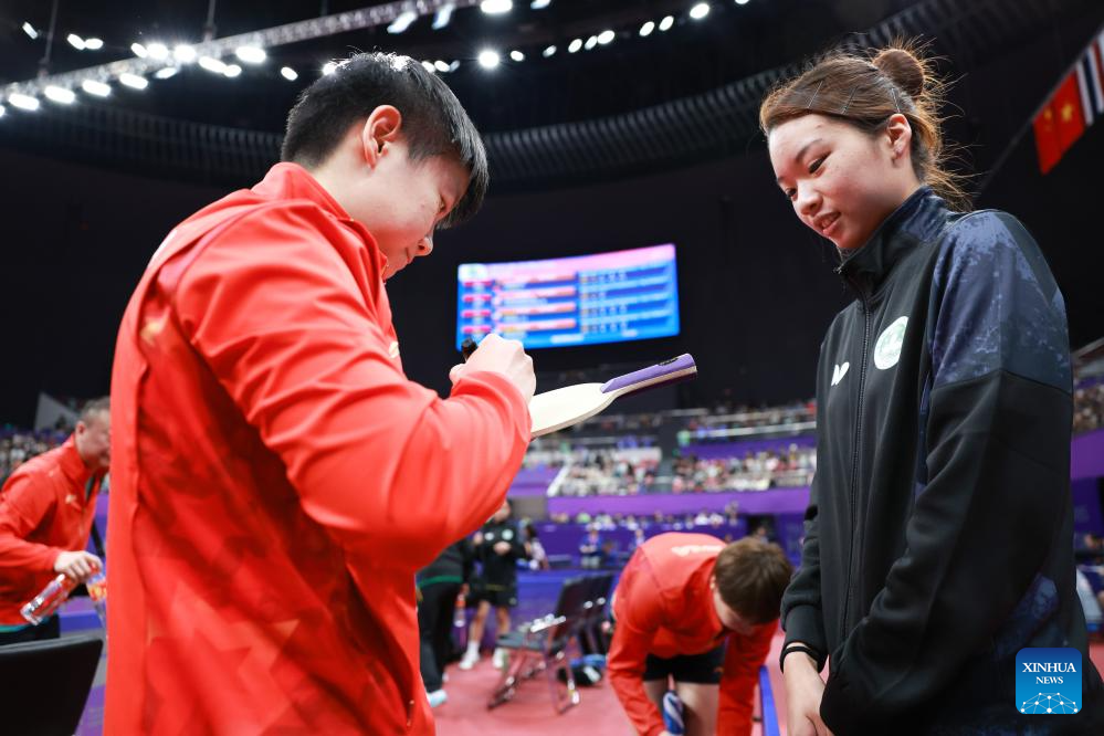 Sun Yingsha of China signs autograph for Seak Hui Li of China's Macao after the women's team preliminary group A match between China and China's Macao at the 19th Asian Games in Hangzhou, east China's Zhejiang Province, Sept. 22, 2023. (Xinhua/Liu Xu)