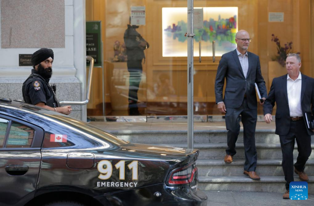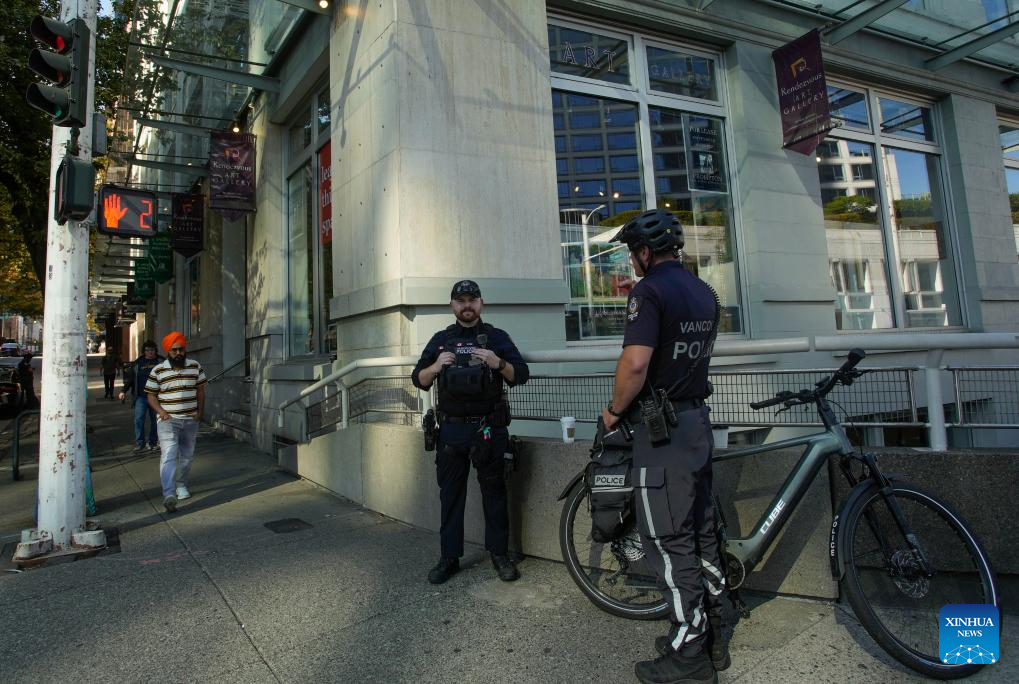 Vancouver police officers are seen outside the building where the office of the Consulate General of India is located in Vancouver, Canada, on Sept. 21, 2023. The Vancouver Police Department is beefing up security outside the office of the Consulate General of India. Canada has expelled a top Indian diplomat for his alleged involvement in the assassination of Canadian Sikh leader Hardeep Singh Nijjar in the Canadian province of British Columbia in June, Foreign Minister Melanie Joly said Monday. (Photo by Liang Sen/Xinhua)