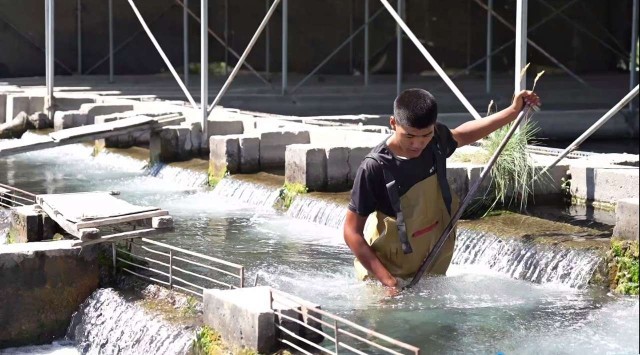At a fish farm located in Wensu county, rows of fish ponds were arranged in an orderly manner. Cold-water fish swam leisurely in the ponds and workers were skillfully catching fish, and then sorting, weighing, and loading them.