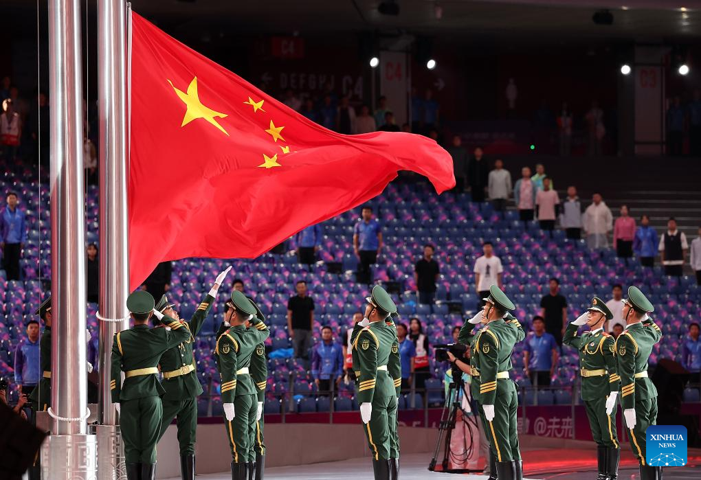 The Chinese national flag is raised during the opening ceremony of the 19th Asian Games in Hangzhou, east China's Zhejiang Province, Sept. 23, 2023. (Xinhua/Jia Haocheng)