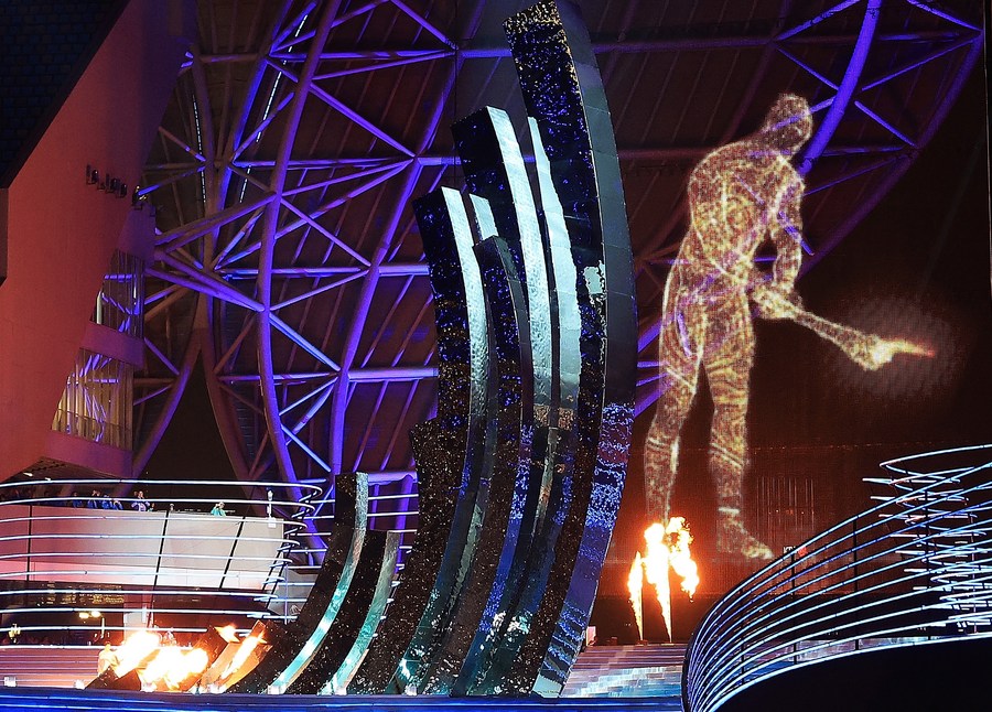 The Games' opening ceremony reached its climax with an unprecedented digital cauldron-lighting ceremony, wherein millions of torchbearers transformed the digital flames into a digital human figure on the Qiantang River before it ignited the cauldron together with swimming Olympic champion Wang Shun, the last of six athletes who relayed the actual flame within the stadium.