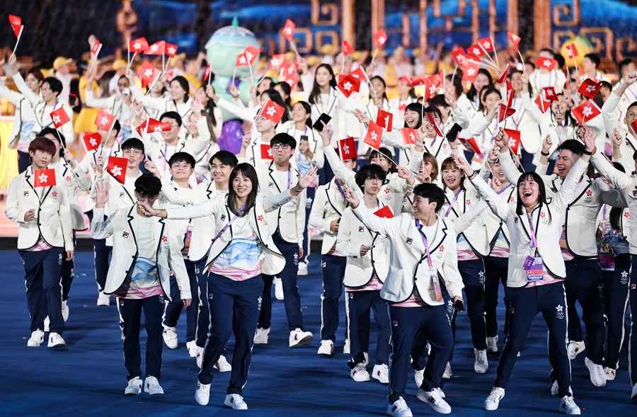 Delegation of China's Hong Kong parades into the Hangzhou Olympic Sports Center Stadium during the Games' opening ceremony. (Xinhua/Cheng Min)