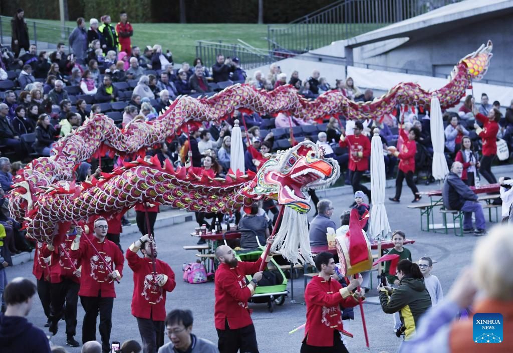 People perform dragon dance during a celebration to mark the upcoming Chinese Mid-Autumn Festival at the Gardens of the World in Berlin, Germany, Sept. 23, 2023. (Xinhua/Ren Pengfei)