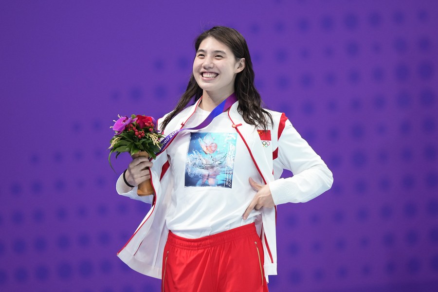 Zhang Yufei of China reacts during the award ceremony for the women's 4x100m freestyle relay at the Hangzhou Asian Games on Sept. 24, 2023. (Xinhua/Du Yu)