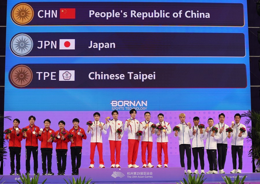 Team Japan, China and Chinese Taipei (L to R) attend the award ceremony of men's artistic gymnastics team event at the Hangzhou Asian Games on Sept. 24, 2023. (Xinhua/Cheng Tingting)