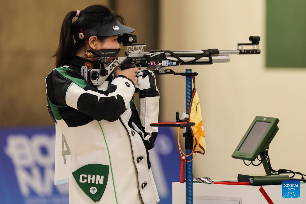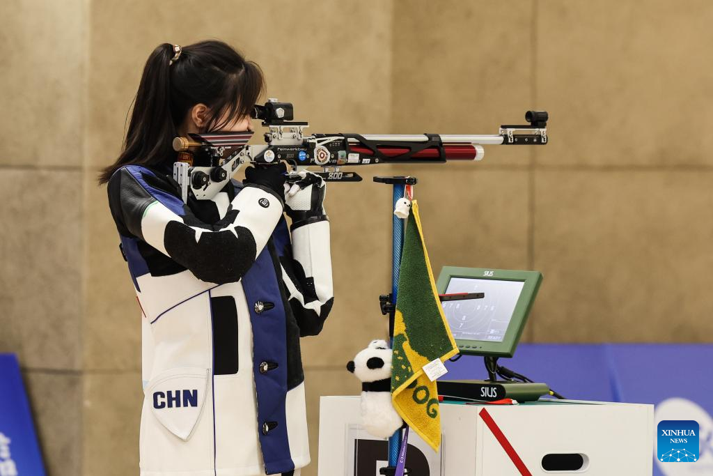 Han Jiayu, Huang Yuting, and Wang Zhilin, all hailing from Zhejiang, secured China's first shooting gold in the women's 10m air rifle team event with 1,896.6 points. Indian shooters followed with 1,886 points for silver, and Mongolia rounded out the podium with 1,880 points for bronze.