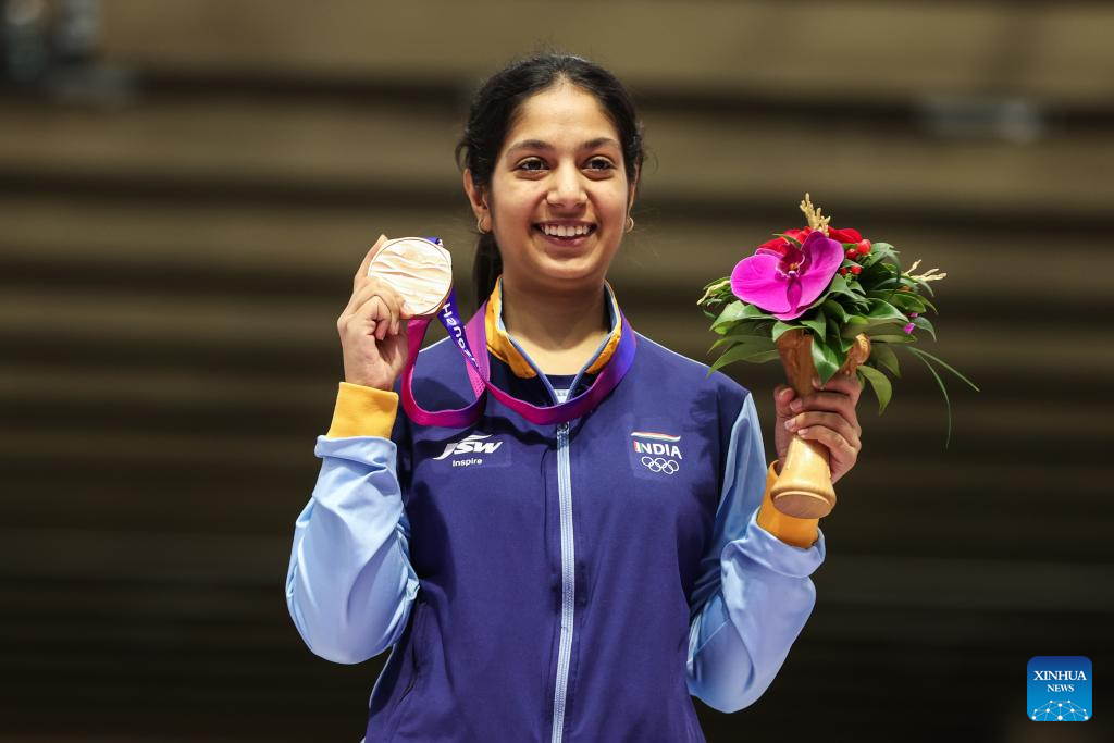 Ramita of India is pictured during the awarding ceremony for the Shooting 10m Air Rifle Women's Final at the 19th Asian Games in Hangzhou, east China's Zhejiang Province, Sept. 24, 2023. (Xinhua/Shan Yuqi)