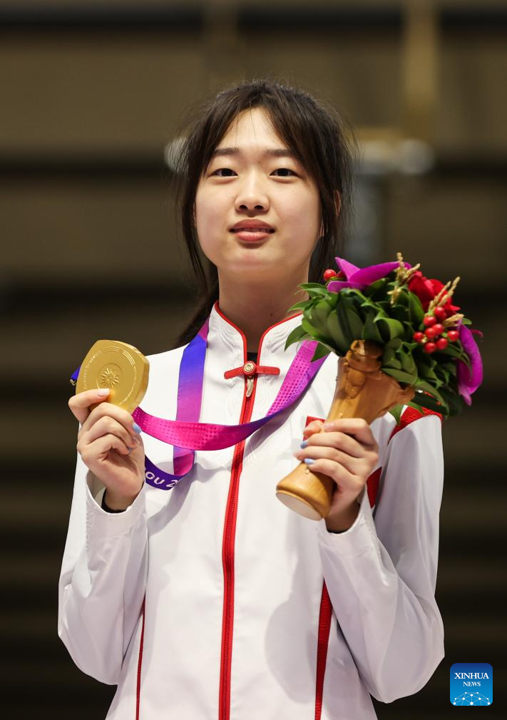 Huang Yuting of China is pictured during the awarding ceremony for the Shooting 10m Air Rifle Women's Final at the 19th Asian Games in Hangzhou, east China's Zhejiang Province, Sept. 24, 2023. (Xinhua/Shan Yuqi)