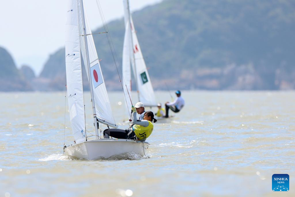 Okada Keiju (R)/Yoshioka Miho of Japan compete during the Mixed Dinghy 470 Race of sailing at the 19th Asian Games in Ningbo, east China's Zhejiang Province, Sept. 24, 2023. (Xinhua/Zhang Tao)
