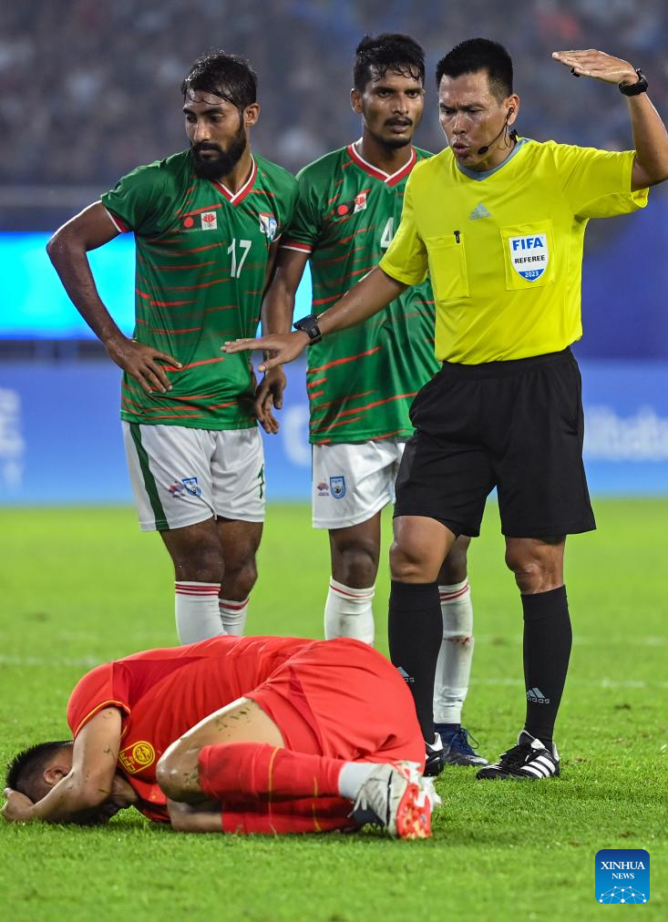 Tan Long of China gets hurt during the Men's First Round Group A match of Football between China and Bangladesh at the 19th Asian Games in Hangzhou, east China's Zhejiang Province, Sept. 24, 2023. (Xinhua/Yan Linyun)