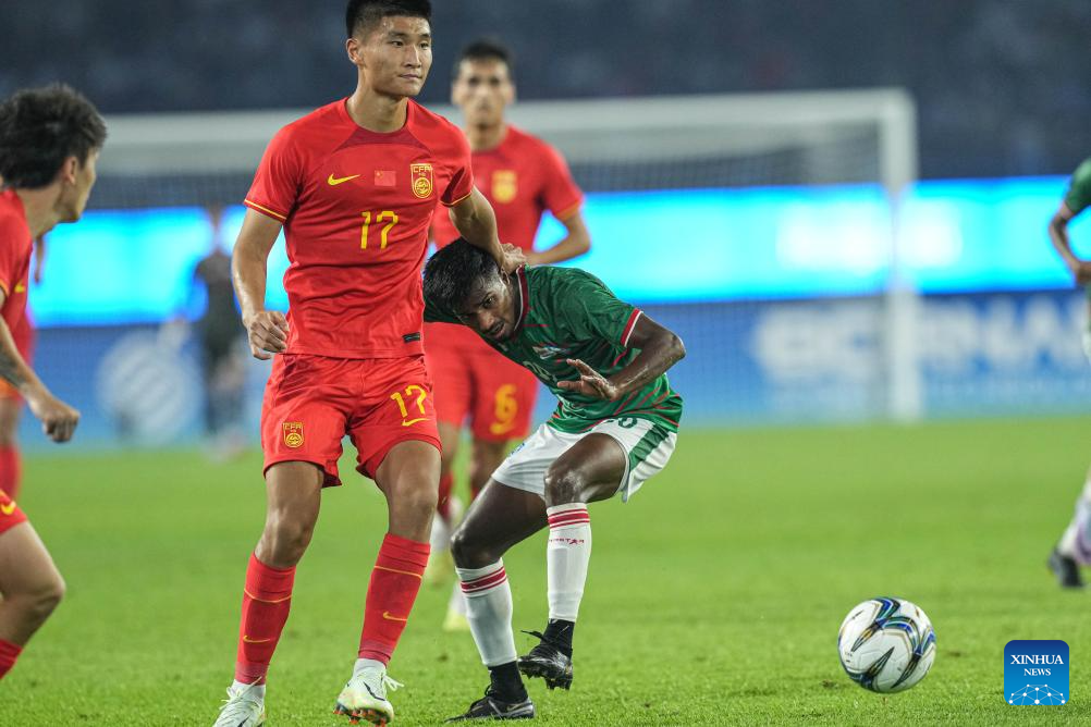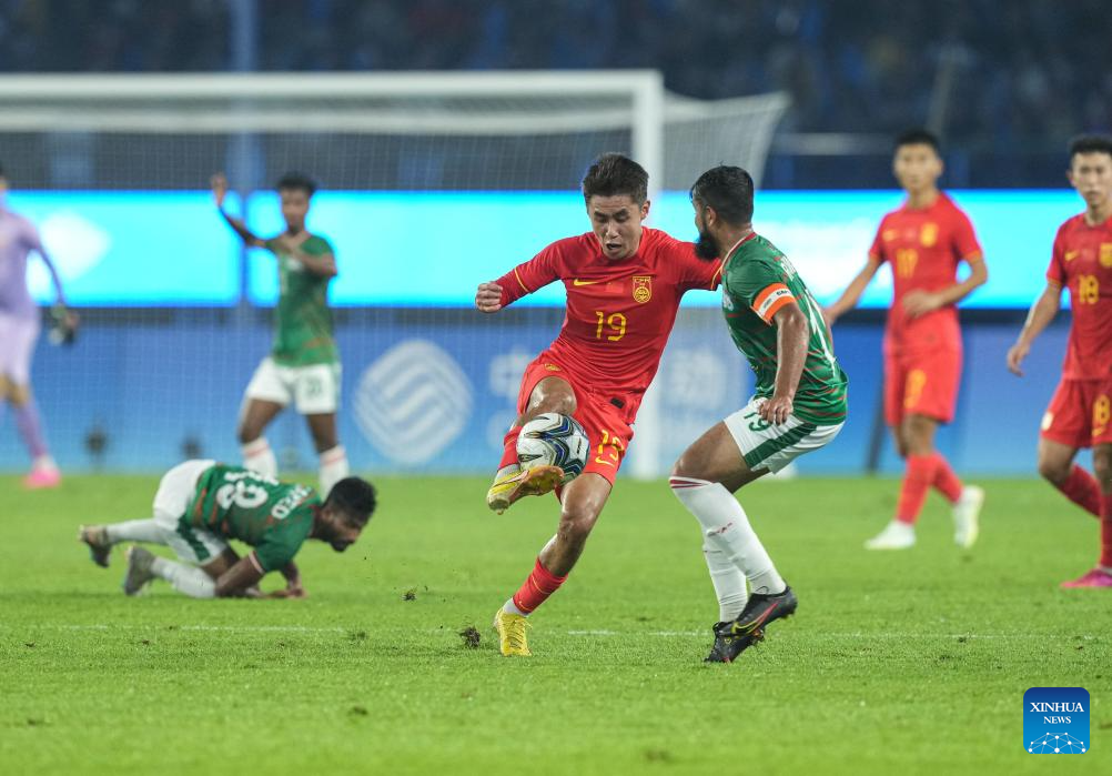Sun Qinhan (C) of China competes during the Men's First Round Group A match of Football between China and Bangladesh at the 19th Asian Games in Hangzhou, east China's Zhejiang Province, Sept. 24, 2023. (Xinhua/Wu Zhuang)